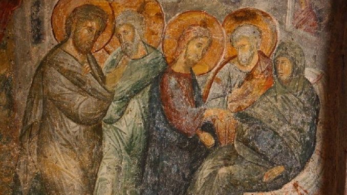 Uscito dalla sinagoga, Gesù si reca nella casa di Pietro, che gli presenta la suocera che stava a letto ammalata. Gesù si avvicina alla donna. Nessuna parola, solo un gesto molto semplice ma significativo. La prende per mano e la fa mettere in piedi. Di fronte a quel gesto di vicinanza, di profonda empatia, la donna da una risposta sorprendente, perché la prima cosa che le viene da fare è quella di mettersi a servire tutti quelli che si trovavano nella casa. Sembra che il contatto con Gesù le abbia trasmesso qualcosa dei suoi sentimenti. Colui che è venuto per servire vuole che i suoi discepoli comincino a fare quello che lui fa: avvicinarsi agli uomini, ai deboli, ai sofferenti, agli emarginati, agli ultimi della società per farsi loro prossimo. Non sappiamo che tipo di donna fosse la suocera di Pietro, ma sappiamo come ha cominciato a comportarsi, subito dopo essere entrata in contatto con Gesù. Quando si incontra Gesù non si può più rimanere come si era prima. Si deve cambiare. In caso contrario, si indurisce il cuore nell’indifferenza e lo si lascia insensibile nei confronti degli altri.