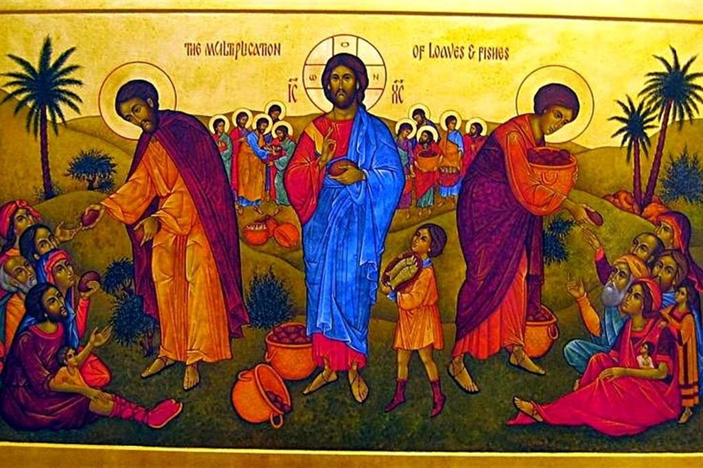Ed in cammino si fa trovare Gesù, in una zona desertica, dove la gente lo segue senza preoccuparsi della fame e della sete, perché affamata e assetata della sua parola. Gesù si rende conto della situazione di questa gente e la accoglie, la fa sentire a suo agio, tanto che stanno a seguirlo fin quasi al tramonto. Nel frattempo Gesù ha continuato a donare loro la sua parola e soprattutto «aveva guarito quanti avevano bisogno di cure» e aveva consolato il cuore della folla. Sul far della sera, i discepoli sembrano impazienti e vorrebbero che Gesù congedasse la folla, per stare un pochino tranquilli. Ma Gesù non la pensa allo stesso modo e provoca i discepoli a un cambio di atteggiamento, che passa dalla chiusura in se stessi alla condivisione. Avevano qualcosa da mangiare, chiaramente insufficiente, e volevano tenerla per loro. Gesù, al contrario, li getta allo sbaraglio: «Voi stessi date loro da mangiare». Non quindi il cibo comprato e ognuno per conto suo, ma il cibo condiviso in spirito di solidarietà. Questo cambio di atteggiamento ha consentito a Gesù di compiere il prodigio, tanto che, con quel poco, non solo tutti hanno mangiato in abbondanza, ma sono rimaste dodici ceste. Il numero è simbolico, per dire che Dio dona in sovrabbondanza, tanto da poter nutrire tutto il suo popolo, di ogni tempo e di ogni luogo.