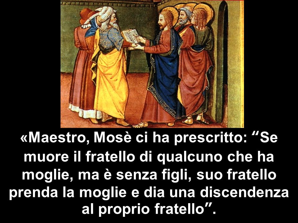 In quel tempo, si avvicinarono a Gesù alcuni sadducei – i quali dicono che non c’è risurrezione – e gli posero questa domanda: «Maestro, Mosè ci ha prescritto: Se muore il fratello di qualcuno che ha moglie, ma è senza figli, suo fratello prenda la moglie e dia una discendenza al proprio fratello. C’erano dunque sette fratelli: il primo, dopo aver preso moglie, morì senza figli. Allora la prese il secondo e poi il terzo e così tutti e sette morirono senza lasciare figli. Da ultimo morì anche la donna. La donna dunque, alla risurrezione, di chi sarà moglie? Poiché tutti e sette l’hanno avuta in moglie». Gesù rispose loro: «I figli di questo mondo prendono moglie e prendono marito; ma quelli che sono giudicati degni della vita futura e della risurrezione dai morti, non prendono né moglie né marito: infatti non possono più morire, perché sono uguali agli angeli e, poiché sono figli della risurrezione, sono figli di Dio. Che poi i morti risorgano, lo ha indicato anche Mosè a proposito del roveto, quando dice: Il Signore è il Dio di Abramo, Dio di Isacco e Dio di Giacobbe. Dio non è dei morti, ma dei viventi; perché tutti vivono per lui».